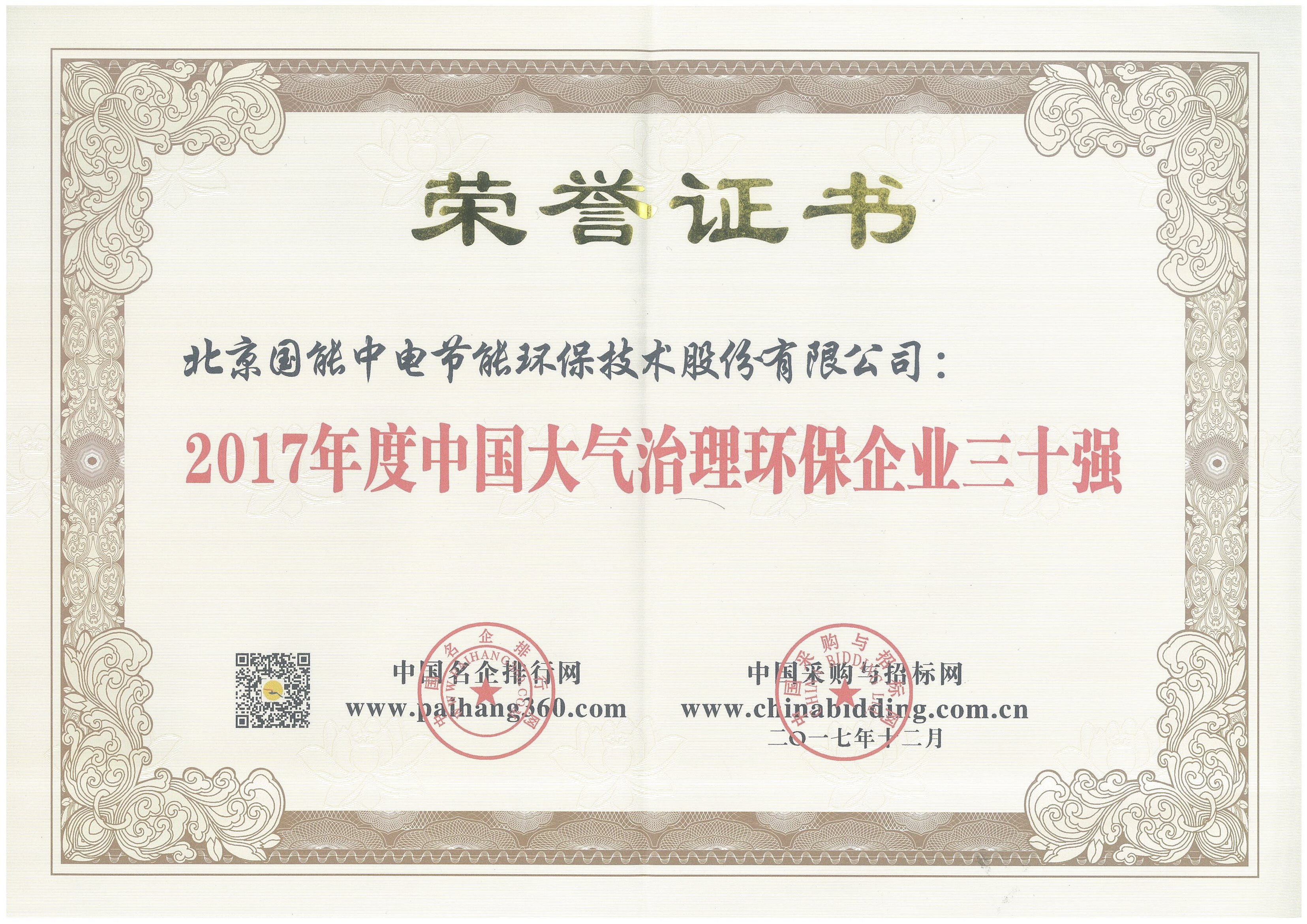 2017年度中國大氣治理環(huán)保企業(yè)三十強