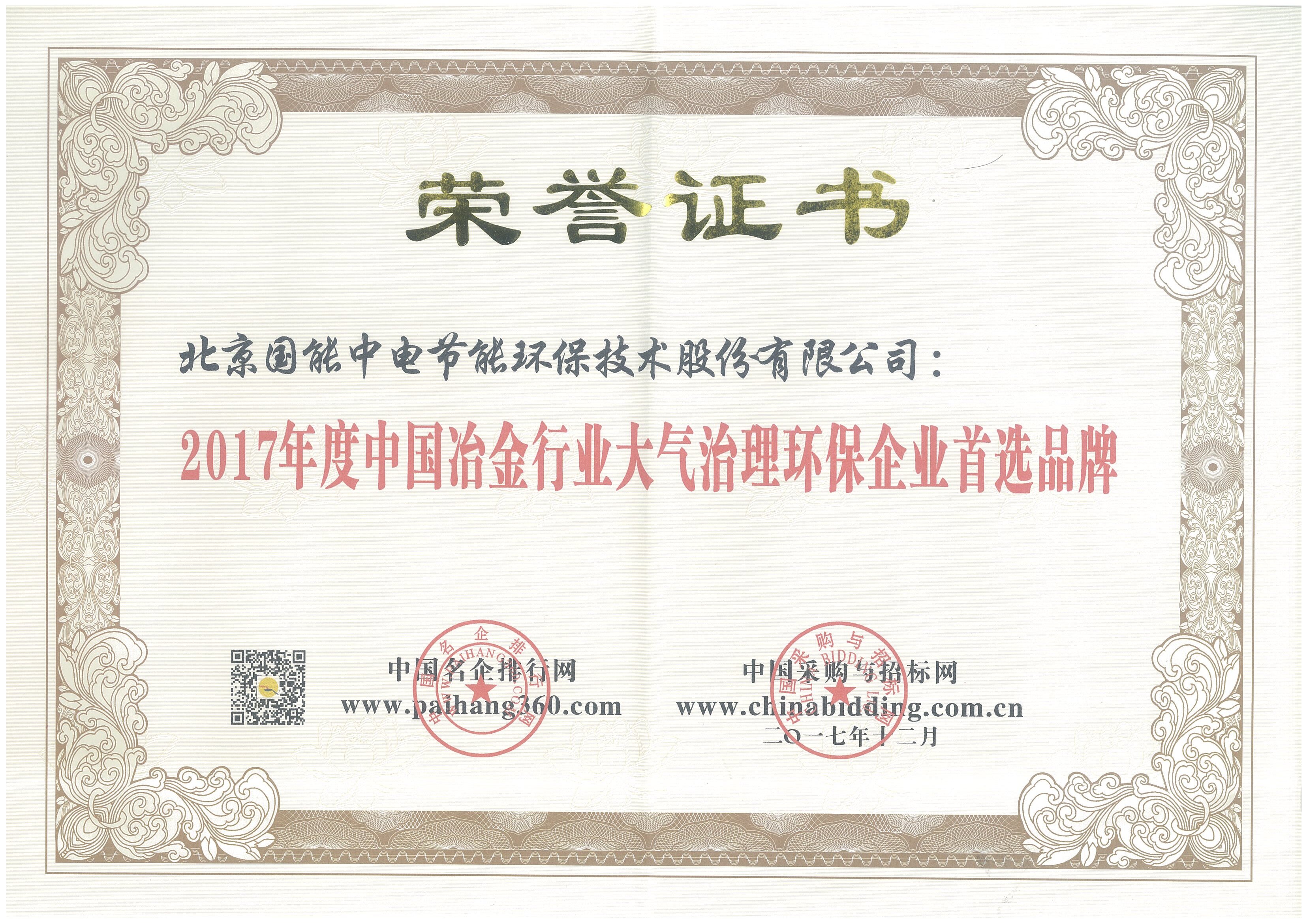 2017年度中國冶金行業(yè)大氣治理環(huán)保企業(yè)首選品牌