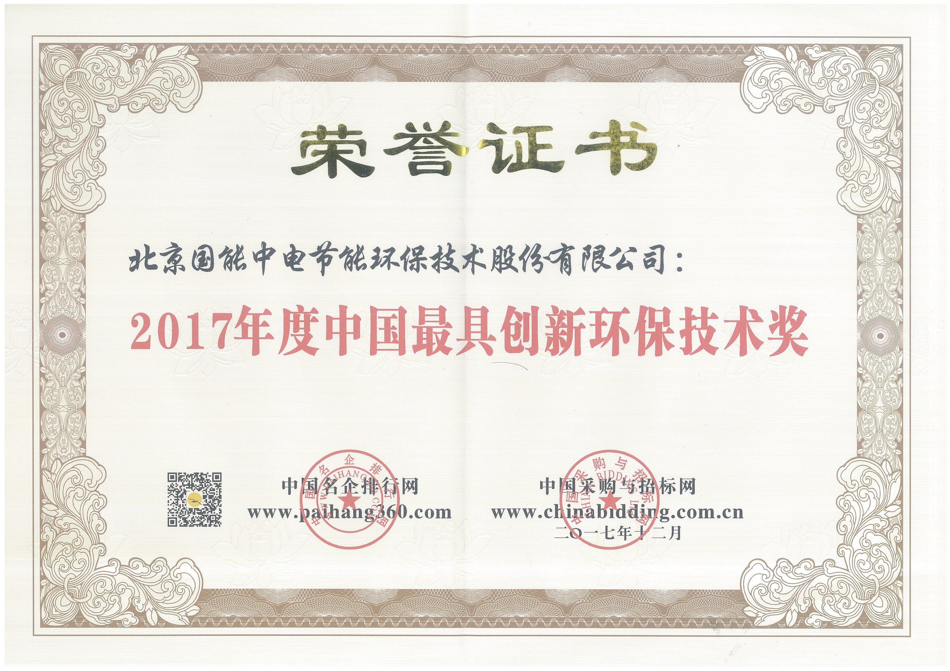 2017年度中國最具創(chuàng)新環(huán)保技術(shù)獎